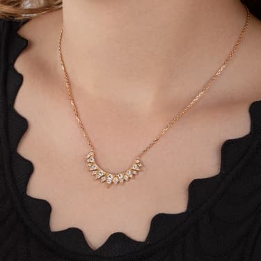 Piaget Sunlight玫瑰金鑽石吊墜。這款玫瑰金鑽石吊墜的設計靈感來自絢麗太陽,邀您踏進陽光璨爛的天地,享受生活。鑽石吊墜上的三角形玫瑰金元素串成半圓,如同太陽光線,綻放歡樂光彩,點亮您的生活。高級吊墜鑲嵌華美白色鑽石,點綴金色放射條紋,帶來極致迷人的效果。在溫暖的陽光下,感受生命中的喜悅,盡情享受生活,體現Sunny Side of Life精神。