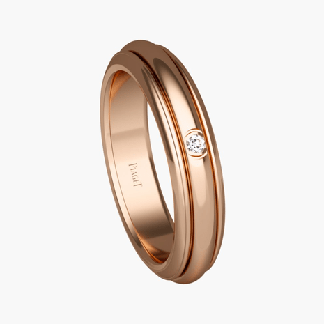 玫瑰金旋轉指環,鑲飾單顆美鑽。這枚超薄奢華指環的設計簡約典雅,中央設玫瑰金旋轉圓環,鑲飾單顆圓形美鑽。旋轉圓環不斷運轉,象徵這世界一切皆有可能。玫瑰金指環每次旋動,都掀動佩戴者追尋的目標和願望。
