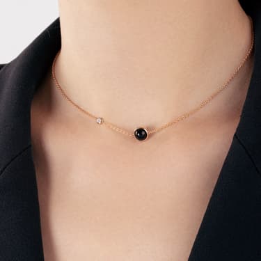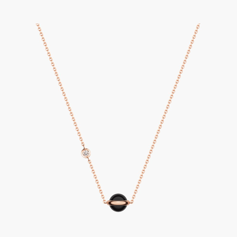 Possession黑色瑪瑙玫瑰金項鏈,鑲飾美鑽。經典的Possession圓環圍繞一顆色彩繽紛的裝飾寶石,幻化成珍貴玫瑰金項鏈,是活力女性的完美伴侶。Possession金質圓環圍繞一顆深邃的黑色瑪瑙,自由轉動。玫瑰金鍊帶搭配璀璨鑽石,令這款饒富趣味的高級項鏈更顯華貴。伯爵Possession系列的色調鮮明大膽,展現女性豐富的魅力。