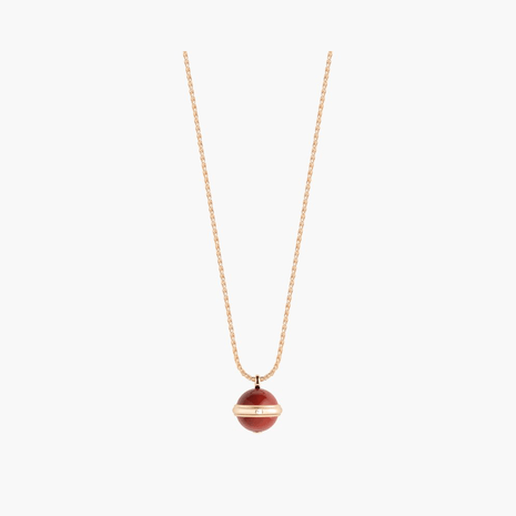玫瑰金長項鏈搭配艷紅光玉髓垂飾,綴以Possesion旋轉圓環。伯爵標誌性珠寶作品,在寶石的點綴下,展現繽紛美態。迷人的寶石彰顯Possession女性的多元情感與個性。伯爵Possesion圓環圍繞兩顆豔紅的光玉髓,化身為典雅的玫瑰金垂飾。旋轉圓環鑲嵌一顆圓形美鑽,散發迷人氣息。佩戴這款珠寶,為精彩的人生路鍍上眩麗色彩,宣示真我形象。透過一個簡單而難忘的動作,輕輕轉動垂飾間的活動圓環,轉出嶄新天地,以色彩描畫樂觀積極的態度,將身心浸沒於靈感之中,讓女性在其中追逐夢想,活出繽紛姿采。