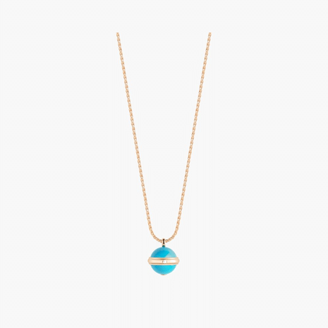 玫瑰金長項鏈搭配彩藍色綠松石垂飾,綴以Possesion旋轉圓環。伯爵標誌性珠寶作品,在寶石的點綴下,展現繽紛美態。迷人的寶石彰顯Possession女性的多元情感與個性。伯爵Possesion圓環圍繞兩顆鮮豔的彩藍色綠松石,化身為典雅的玫瑰金垂飾。旋轉圓環鑲嵌一顆圓形美鑽,散發迷人氣息。佩戴這款珠寶,為精彩的人生路鍍上眩麗色彩,宣示真我形象。透過一個簡單而難忘的動作,輕輕轉動垂飾間的活動圓環,轉出嶄新天地,以色彩描畫樂觀積極的態度,將身心浸沒於靈感之中,讓女性在其中追逐夢想,活出繽紛姿采。