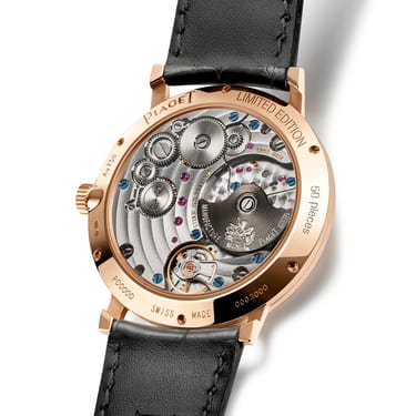 Altiplano至臻超薄Origin腕表,直径40毫米。18K玫瑰金表壳。陨石表盘。蓝宝石水晶透明底盖。搭载1203P超薄自动机械机芯,设日期显示功能。限量发行50枚。