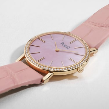 玫瑰金钻石腕表。粉色珍珠母贝表盘。粉色鳄鱼皮表带。这款女士玫瑰金钻石高级腕表,华美呈现ALTIPLANO系列所独有的美学风格。粉色珍珠母贝表盘上交替点缀单双金质时标,搭配纤细巴顿指针。这款34毫米纤薄表壳镶嵌72颗璀璨钻石,并搭载430P超薄手动上链机械机芯,配备中央小时和分钟显示功能。这款珍珠母贝超薄腕表搭配粉色鳄鱼皮表带及针扣式表扣,限量发行300枚。