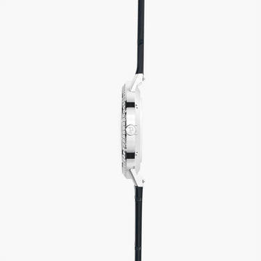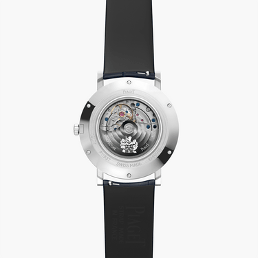 精致Altiplano系列女士腕表,白金表壳,501P自动上链机芯。Piaget伯爵对超薄腕表追寻的结晶,Altiplano系列不断突破机芯领域新纪录。这款女士高级腕表传承超薄传统,设计简约大方,搭载厚度仅为3.6毫米的超薄自动上链机芯,搭配亮面蓝色鳄鱼皮表带和镶钻表圈。白金镶贴时标位于阳光射线雕纹银色表盘之上,璀璨光芒与经典设计相交互映。
