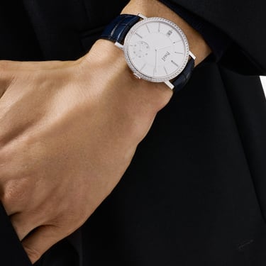 Altiplano至臻超薄腕表,40毫米白金表壳,镶钻表圈。腕表结合时尚和经典风格,搭配精致超薄制表技术,成为您的忠实伴侣。男士高级腕表搭载1205P1机芯,缔造双重世界纪录。这款Altiplano至臻超薄腕表的复杂功能运用微型摆陀概念,配以3毫米机芯。这款腕表的总厚度仅6.36毫米,是同类腕表中的超薄设计,令人叹为观止。银色表盘搭配镶钻表圈,为精湛技艺增添优雅和魅力。双层结构表盘上时标交替排列,小秒针位于4时位置,日期显示位于9时位置。这款白金男士腕表散发优雅气息,体现勇于突破的精神,展现制表技艺与美学传统。