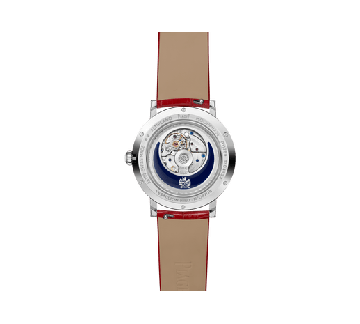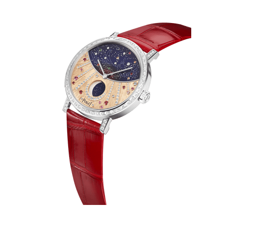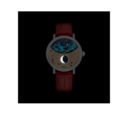 这款36毫米Altiplano至尊超薄月相女士钻石腕表设有SuperLumiNova®夜光涂层珐琅表盘,象征南方守护神——朱雀。限量版Altiplano至臻超薄月相表款,绽放多重魅力。大师工艺表盘缀以珐琅元素、钻石、黄金镌刻“宫廷式图腾”装饰,SuperLumiNova®夜光涂层和围绕表盘的镶钻表圈,为设计锦上添花。在黑夜,SuperLumiNova®夜光涂层将显现出月亮和隐藏的星宿。此白金钻石腕表的内部搭载自动上链机芯,其设有月形摆陀,透过蓝宝石水晶透明底盖清晰可见,印证Piaget伯爵的卓越工艺。这款奢华月相女士腕表配搭柔软红色鳄鱼皮表带,设计赏心悦目。