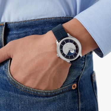 白金钻石月相腕表。蓝色砂金石玻璃密镶钻石表盘。蓝色鳄鱼皮表带。这款女式复杂功能腕表巧妙融合多种造型,优雅迷人。白金圆形表壳直径36毫米,圆形表盘上设有椭圆形窗口,表圈镶嵌渐变钻石,华美映衬独特的腕表复杂功能——月相显示。月相显示设于表盘中央的窗口,窗口边缘密镶钻石。蓝色砂金石玻璃表盘上设金质镶贴时标、剑形指针和精致的星形秒针。584P自动上链机械机芯与黑色摆陀,在蓝宝石水晶透明表背之下一览无余。 砂金石玻璃(Aventurine glass),亦被称为“金星玻璃”(goldstone)。它得名于意大利语中的“avventura”一词,意为“冒险”。砂金石玻璃的制造工艺可追溯至17世纪,据说最早发源于威尼斯附近的穆拉诺(Murano)。工匠在玻璃中添加氧化铜,赋予其闪闪发光的美丽外观,宛如繁星闪耀的深蓝色夜空。