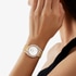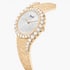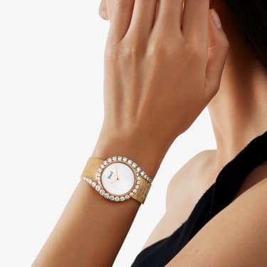 Limelight Gala Precious腕表,直径32毫米。18K玫瑰金表壳,镶饰42颗明亮式切割美钻(约 4.74 克拉)。白色珍珠母贝表盘镌刻Decor Palace(宫廷式图腾)装饰。18K玫瑰金表链,镌刻Decor Palace(宫廷式图腾)装饰。蓝宝石水晶透明底盖。搭载501P1自动机械机芯。
