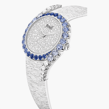 领略这款Limelight Gala系列白金蓝宝石钻石腕表的魅力华彩,表链点缀Decor Palace(宫廷式图腾)装饰图案,表盘雪花密镶璀璨钻石。这款高级女士腕表对1973年的复古作品予以令人惊叹的重新演绎,将经典流传的迷人魅力推向新的高度。这款限量版腕表的表盘饰有大小不一的雪花密镶钻石,璀璨华光摄人心魄。不对称的纤长表耳呈现出从白色钻石演变成深蓝色蓝宝石的渐变效果。Decor Palace(宫廷式图腾)装饰图案白金表链采用卓著的专业技艺,经过悉心的手工雕刻,延续怡人的纹理质感和光影律动。这款腕表呈现该系列标志性的丰盈饱满轮廓,从表盘到表链尽释璀璨华光。
