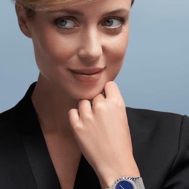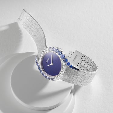 18K白金Limelight Gala系列腕表,32毫米表壳,镶饰渐变式美钻和蓝宝石,手工精心雕刻的Decor Palace(宫廷式图腾)装饰表带和表盘。这款腕表忠实再现1973年经典款式的迷人魅力。Limelight Gala系列高级女士腕表尽显经典和现代的碰撞,令人着迷。表圈镶饰渐变式美钻,衬托腕表精致造型。目光追随纯净钻石到深色蓝宝石的变化,被Decor Palace(宫廷式图腾)装饰表带的华美吸引。这款限量版腕表的白金表带雕刻独特“宫廷式图腾”,非凡质感熠熠生辉,如丝般柔滑拂过腕间。表盘经过同样工艺雕刻,并以大明火(Grand Feu)珐琅润饰,精美彩绘通过透明蓝色珐琅鲜明舞动。这款瑞士女士腕表的柔美线条散发经典优雅韵味,精湛工艺和现代技术打造曼妙金质腕表造型。