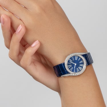 这款高级女士腕表重新诠释1973年的一款古董表款,两只优雅延伸的表耳烘托出优雅圆形表壳,柔美曲线贴合手腕。表圈镶嵌大小不一的圆形美钻,凸显曼妙造型。蓝色表盘纯粹而低调,散发现代柔美韵味。这款腕表搭配优雅的鳄鱼皮表带。