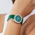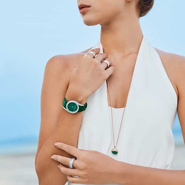 女士白金腕表,镶饰钻石。绿色孔雀石表盘。孔雀石绿色鳄鱼皮表带。这款高级腕表重新演绎1973年诞生的标志杰作,表壳镶满圆形美钻,优雅的18K白金圆形表壳直径为32毫米,一对纤长拱形表耳完美贴合手腕。孔雀石表盘搭配鳄鱼皮表带,曲线柔美,尽显兼具隽永魅力的现代风格。这款璀璨动人的高级女士腕表仅在PIAGET伯爵专卖店独家出售。