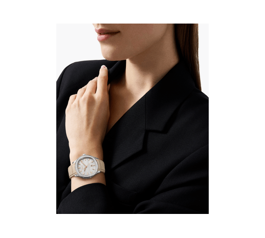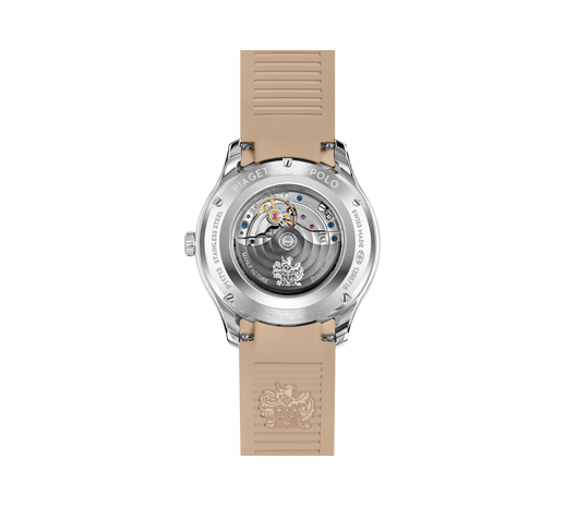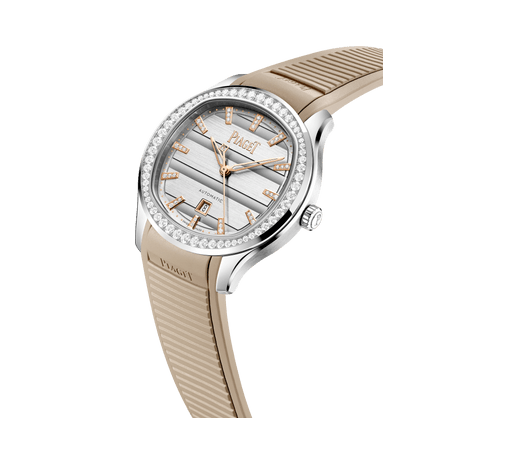Piaget伯爵Polo Signature Date系列腕表,36毫米。精钢表壳,镶饰60颗明亮式切割美钻(约0.97克拉)。表盘时标镶饰35颗明亮式切割美钻(约0.07克拉)。可替换式米色橡胶表带。蓝宝石水晶透明底盖。Piaget伯爵自制500P1自动机械机芯。