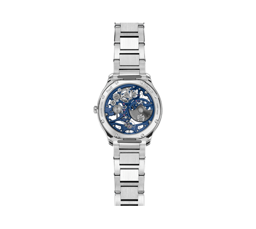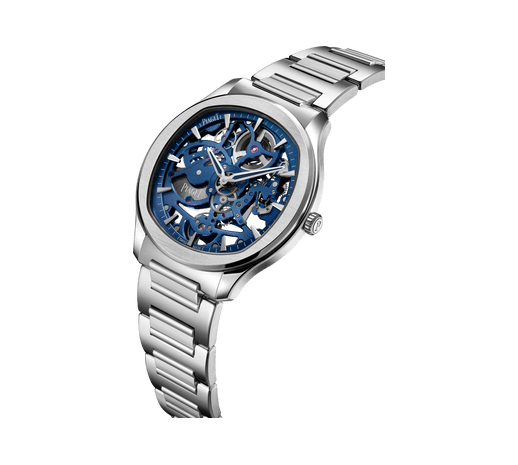 Piaget伯爵Polo系列镂空腕表,直径42毫米。精钢表壳。蓝宝石水晶透明底盖。可替换式精钢链带。腕表随附深蓝色橡胶表带和精钢折叠式表扣。Piaget伯爵自制1200S1蓝色调自动机芯。