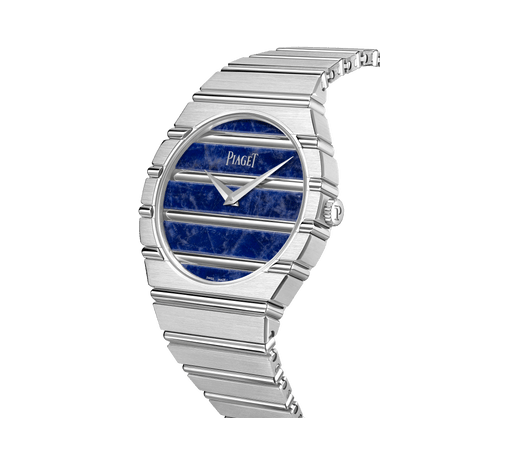 Piaget伯爵Polo系列 79腕表,直径38毫米。镀铑饰面18K白金表壳、表盘和表链。蓝色方钠石表盘(约2.8克拉)。Piaget伯爵标志性圆纹凹槽装饰与缎面打磨金色元素交替排列。表链与表壳浑然一体。蓝宝石水晶透明底盖。Piaget伯爵自制1200P1自动机芯,配备灰色涂层22K黄金微自动陀。 腕表 G0A51151