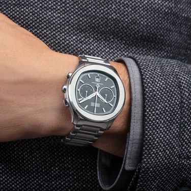 男士自动上链计时腕表。深灰色饰纹表盘。精钢表链。这款自动上链计时腕表尽显现代风范与优雅气质,适合各种场合佩戴。表盘直径为42毫米,防水深度达10ATM,造型巧妙融合圆形与枕形,忠实延续伯爵传统美学风格,搭配拥有折叠式表扣的抛光缎面打磨精钢表链。深灰色饰纹水平表盘上镶贴夜光时标,搭配太子妃指针和秒针,拥有中央小时、分钟、秒针显示和计时码表功能,日期显示设于6时位置。透过这款高级男士腕表的蓝宝石水晶透明底盖,可尽览精美的伯爵自制1160P自动上链机芯以及镌刻伯爵家族徽章的深灰色摆陀。