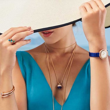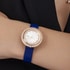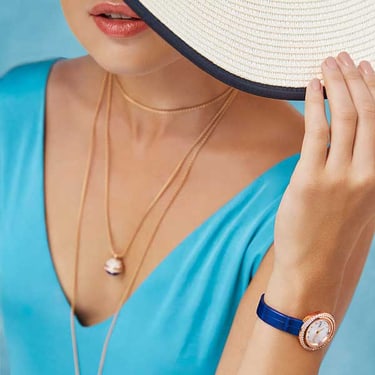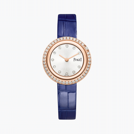 女士玫瑰金腕表,镶饰钻石。银色镶钻表盘。旋转表圈。青金石蓝色鳄鱼皮可更换表带。这款高级女士腕表以Possession系列的标志性旋转圆环为灵感,巧妙搭配玫瑰金材质与璀璨美钻,彰显标志性风格。旋转表圈镶饰一圈耀眼钻石,华丽映衬点缀镶钻圆点时标的银色表盘。这款腕表搭配青金石蓝色鳄鱼皮表带及镀玫瑰金针扣,直径为29毫米的圆润玫瑰金镶钻表壳设有可更换系统并附赠备用表带,可根据个人风格随心更换。