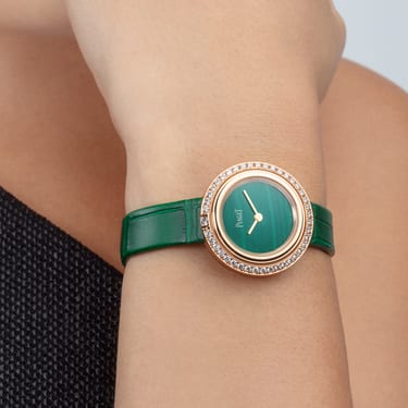 女士玫瑰金钻石腕表。绿色孔雀石表盘。旋转表圈。可替换式孔雀石绿色鳄鱼皮表带。为了庆祝生命中的荣耀时刻,Possession时来运转系列腕表的旋转圆环搭配色彩醒目鲜明的装饰性宝石表盘。这款玫瑰金腕表搭配镶钻表圈,是推陈出新的时尚象征,其特色在于炫彩夺目的绿色孔雀石表盘。与之相配的孔雀石绿色鳄鱼皮表带,搭配玫瑰金针扣,并融合精妙的可替换式系统,令佩戴者可随心变换风格。这款高级女士腕表仅在PIAGET伯爵精品店发售。