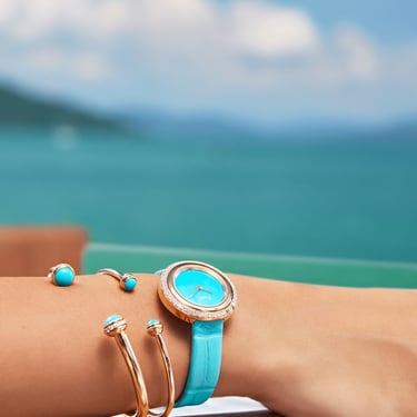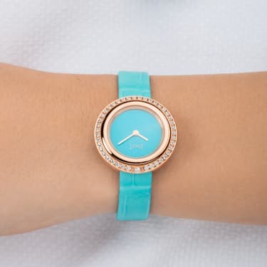 女士玫瑰金钻石腕表。天然绿松石表盘。旋转表圈。可替换绿松石蓝色鳄鱼皮表带。为了庆祝生命中的荣耀时刻,Possession腕表的旋转圆环搭配色彩醒目鲜明的装饰性宝石表盘。这款玫瑰金腕表搭配镶钻表圈,是推陈出新的时尚象征,其特色在于明亮的蓝色绿松石表盘。与之相配的绿松石蓝色鳄鱼皮表带,搭配玫瑰金针扣,并融合精妙的可替换式系统,令佩戴者随心变换风格。这款高级女士腕表仅在PIAGET伯爵精品店发售。