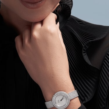 女士白金钻石腕表。镶钻表盘、旋转表圈和表链。这款女士钻石腕表凭借璀璨钻石,展现动人活力和自由精神,可谓华美魅力的隽永象征。这款白金高级珠宝腕表的灵感源自标志性POSSESSION旋转戒指,其29毫米表壳、旋转表圈、表盘和表链均密镶钻石。其钻石网球表链运用PIAGET伯爵在20世纪80年代开发的独特工艺精心打造,格外柔软舒适,尽显品牌的精湛珠宝造诣。