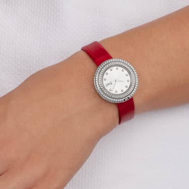 女士白金腕表,镶饰钻石。珍珠母贝镶钻表盘。旋转表圈。红色鳄鱼皮可更换表带。这款高级女士腕表以Possession系列的标志性旋转圆环为灵感,巧妙搭配白金材质与璀璨美钻,彰显标志性风格。旋转表圈密镶耀眼钻石,华美映衬点缀镶钻圆点时标的珍珠母贝表盘。这款腕表搭配针扣红色鳄鱼皮表带,直径为29毫米的圆润白金镶钻表壳设有可更换系统,可自由随心地变换风格。